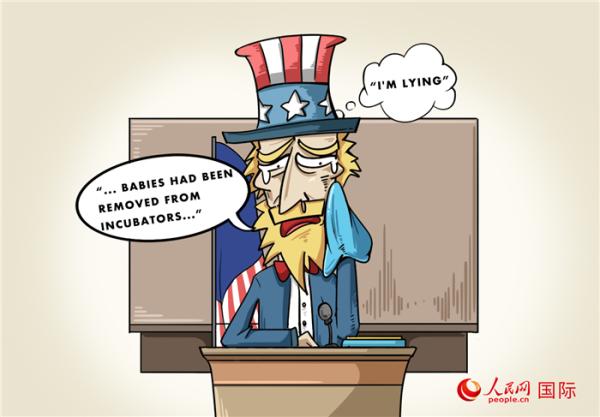 “我看到伊拉克士兵拿着枪冲进医院,闯入病房,育婴箱内有15名婴儿。他们把婴儿从育婴箱里取出来,任由孩子们躺在冰冷的地面上死去。”当时,一位自称是“科威特志愿者”的15岁少女在美国国会上声泪俱下地对伊拉克士兵进行指控。