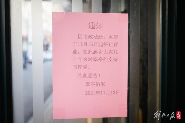 2021年11月15日,位于黄浦区福建路地块的翠亭酒家迎来旧改生效后的最后一天营业日。