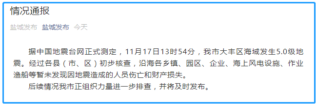 据中国地震台网正式测定,11月17日13时54分,我市大丰区海域发生5.0级地震。经过各县(市、区)初步核查,沿海各乡镇、园区、企业、海上风电设施、作业渔船等暂未发现因地震造成的人员伤亡和财产损失。