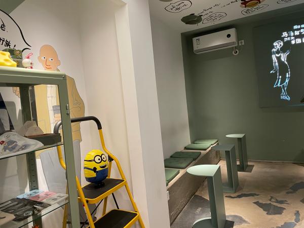 吸引力常常来自于店主自身。相较于连锁咖啡馆,独立咖啡馆之所以“独立”,是因为能够充分反映店主的性格、喜好以及开店时的所思所想。“怎样的老板吸引怎样的客人。”膘哥解释道。他的咖啡馆采用薄荷绿的清新色调,吧台上的小圆瓶里,养着一只可供观赏的蝈蝈。尽管店内陈设简单,但天花板上颇具时尚感的手绘人物与上海话元素“五个模子”的结合,显示出店主的匠心。