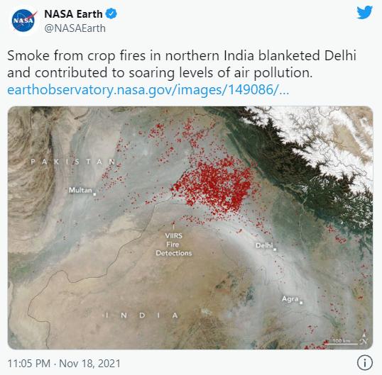 nasa18日在社交平台上发文称,印度北部燃烧秸秆产生的烟雾笼罩着新德里,导致空气污染水平飙升。报道称,卫星图像的日期是11月11日,卫星探测到印度西北部有大量烟雾。nasa马歇尔太空飞行中心大学空间研究协会的科学家帕万·古普塔表示,“从11月11日的烟雾规模和该地区的人口密度来看,保守估计这一天印度至少有2200万人受到烟雾污染的影响。”