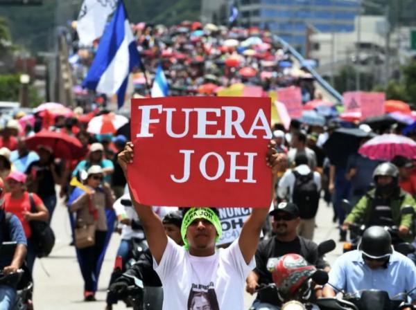 ·举着“joh(胡安·埃尔南德斯名字缩写)滚蛋”标语的洪都拉斯抗议者。