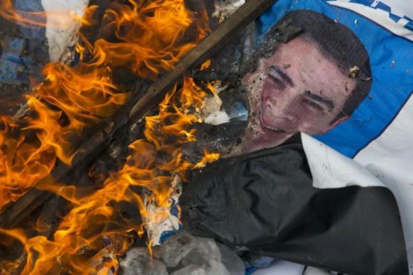 ·洪都拉斯抗议者焚烧的胡安·埃尔南德斯的画像。
