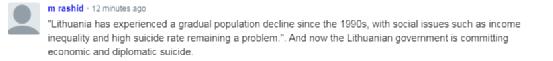也有网友提到,“立陶宛自20世纪90年代以来经历了人口逐渐减少,还伴随着例如收入不平等和高自杀率等社会问题,这些(至今)仍然是社会问题。而且现在,立陶宛政府正在进行经济和外交自杀。”