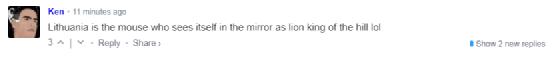 相关内容也在社交媒体上掀起讨论。在rt的评论区内,有外国网友称,“立陶宛是只老鼠,(却)在镜子里把自己看成是狮子王,哈哈哈。”