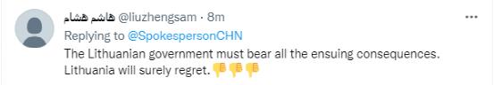 还有网友认为,“立陶宛政府必须承担所有随之而来的后果。立陶宛肯定会后悔的。”