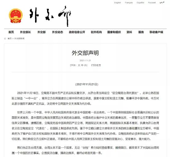 当天早些时候,中国外交部发布声明将中立两国外交关系降为代办级。中国外交部21日发表声明称,2021年11月18日,立陶宛不顾中方严正抗议和反复交涉,允许台湾当局设立“驻立陶宛台湾代表处”。此举公然在国际上制造“一中一台”,背弃立方在两国建交公报中所作政治承诺,损害中国主权和领土完整,粗暴干涉中国内政。中方对此表示强烈不满和严正抗议,决定将中立两国外交关系降为代办级。