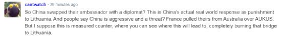 有网友写道:“所以中国把他们的大使换成了外交官?这是中国在现实世界中对立陶宛的惩罚。还有人说中国咄咄逼人,是一个威胁?法国(可是)因美英澳三边安全联盟(aukus)撤回了他们在澳大利亚的大使。我认为这是一个衡量标准,在这件事上你可以看到可能会导致什么后果……”