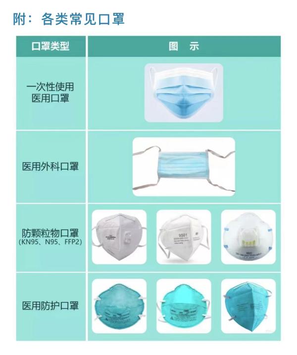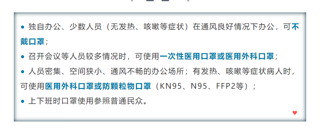 ·人员密集、空间狭小、通风不畅的办公场所;有发热、咳嗽等症状病人时,可使用医用外科口罩或防颗粒物口罩(kn95、n95、ffp2等);