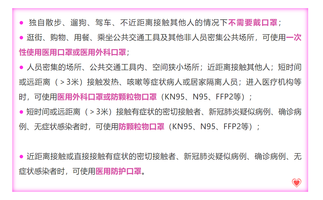 ·近距离接触或直接接触有症状的密切接触者、新冠肺炎疑似病例、确诊病例、无症状感染者时,可使用医用防护口罩。