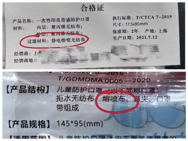 对于口罩是否含有熔喷布,不难辨别:正规产品均应在包装上注明原材料,如果使用了熔喷布,会有明确标注。
