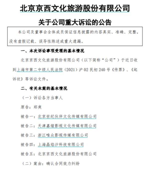 st北文公告称,公司近日收到上海市第二中级人民法院(2021)沪 02 民初 240 号《传票》、《起诉状》等诉讼文件。原告为郑爽,被告方共5个。郑爽请求判令上海晶焰沙科技有限公司向原告支付 1.0825 亿元,请求判令北京世纪伙伴文化传媒有限公司、天津嘉煊影视文化传媒有限公司、浙江唯众影视传媒有限公司、北京京西文化旅游股份有限公司(简称st北文)对1.0825亿支付义务承担连带责任。