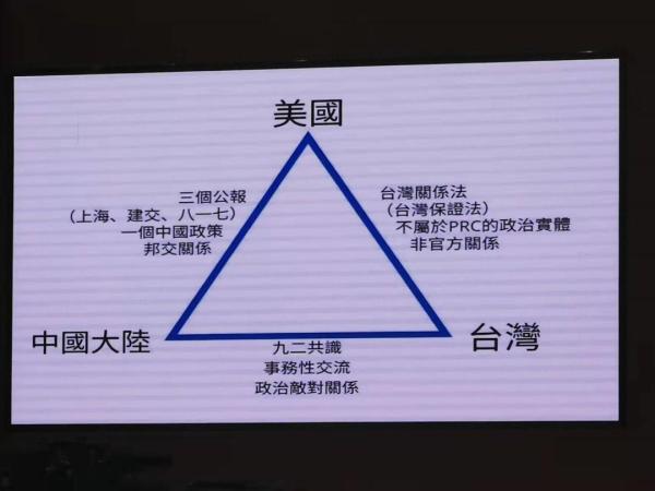 张亚中以美中台三角关系结构图分析说,蔡英文2016年上台后不接受“九二共识”,所以台湾跟大陆这条线就断掉了。三条线中只有美国掌握了跟大陆的关系,也掌握了跟台湾的关系。所以他认为,未来美中台三角关系主动权掌握目前在美国手上。而美国自然有它的利益考量。比如,台湾对美国来讲,现在就是“最大的肥羊”,可以不断卖武器给台湾。