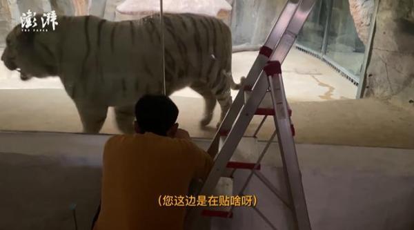 22日上午,澎湃新闻记者走进一间“虎景房”,有工作人员在工作,其称正在给玻璃贴防爆膜。玻璃的另一边,一只老虎正在来回走动,时不时探头向房间里张望,另有一只体型较小的老虎正卧地休息。
