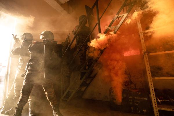 居民地反劫持战斗中特战队员利用烟雾弹掩护突入楼内