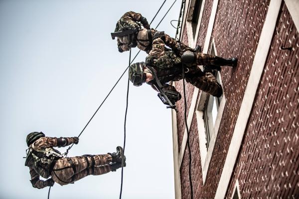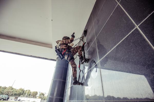 居民地反劫持战斗中特战队员利用绳索突入楼内