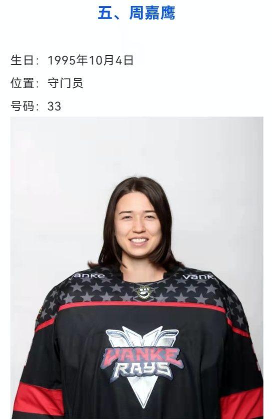 中国女冰的明星球员,无疑是作为归化球员的门将周嘉鹰。她目前保持着普林斯顿大学女子校队的多项门将个人纪录,包括场均丢球,获胜场次,以及扑救率。2017年,周嘉鹰被深圳昆仑鸿星选中,并参加了cwhl和三个赛季的whl,进步明显。这应该是中国女冰在“中国冰上长城“郭宏之后,具有世界顶尖水平的女子冰球门将。