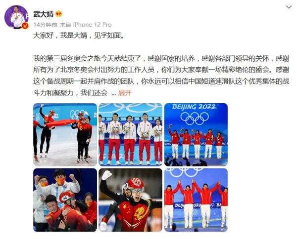 我的第三届冬奥会之旅今天就结束了,感谢国家的培养,感谢各部门领导的关怀,感谢所有为了北京冬奥会付出努力的工作人员,你们为大家奉献一场精彩绝伦的盛会。感谢这个备战周期一起并肩作战的团队,你永远可以相信中国短道速滑队这个优秀集体的战斗力和凝聚力,我们还会继续努力,为大家带来更多的快乐和荣誉。