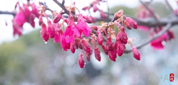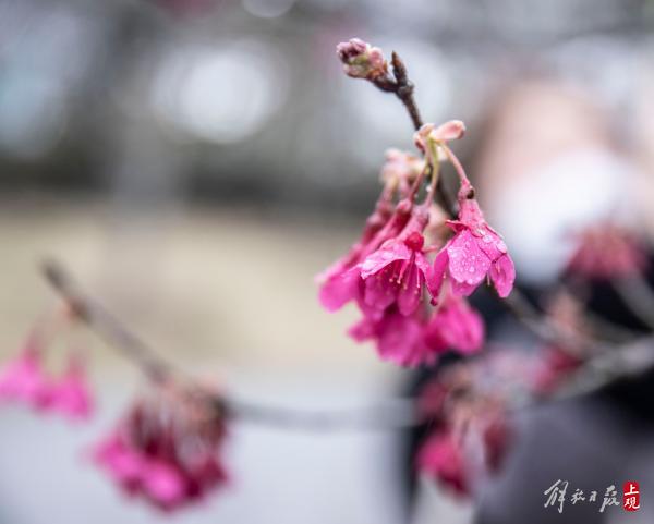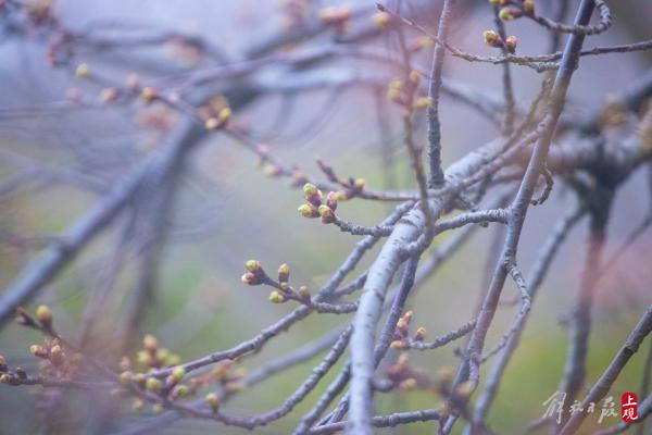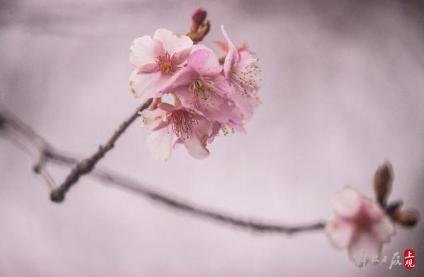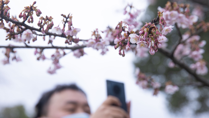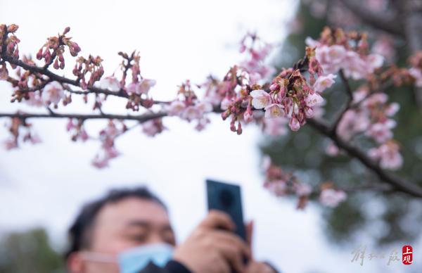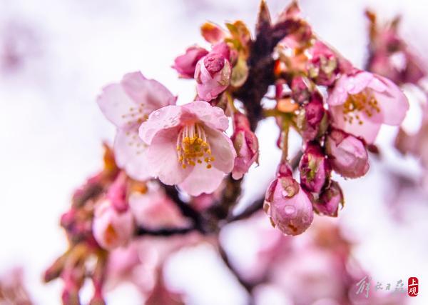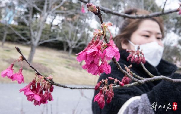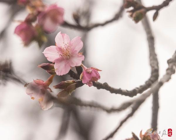 顾村公园三号门入口处的一棵寒樱已进入盛花期。据顾村公园工作人员介绍:大渔樱目前还处于含苞阶段。