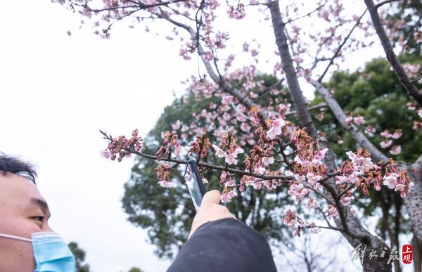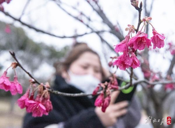 顾村公园三号门入口处的一棵寒樱已进入盛花期。