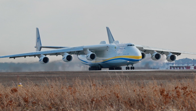 安-225运输机在苏联时期制造,只有唯一一架,于1988年12月完成首次试飞。这架运输机机长84米,翼展88.4米,高18.1米,由6台发动机提供动力,最大载重量250吨。研制这架巨型飞机的目的是运输大型航天设备,如火箭零部件和航天飞机零部件,其顶部可搭载“暴风雪”号航天飞机。