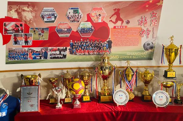 梅陇中学女足宿舍进门处摆满奖杯 侍佳妮摄