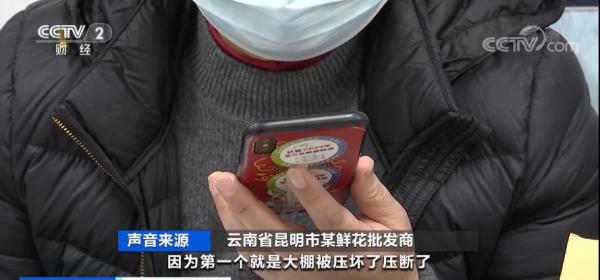 云南省昆明市某鲜花批发商:下雪是有影响的,因为第一大棚被压坏、压断了,里边的花就直接不能用了;第二,下雪之后温度太低了,玫瑰、草花、配花等都不同程度受到了冻害。