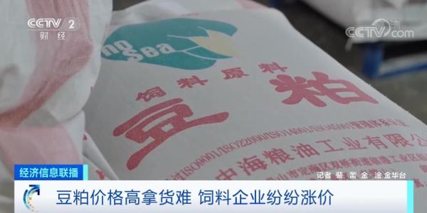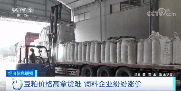 在浙江金华的一家饲料生产企业,一辆装着三十多吨豆粕的大货车正在卸货。相关负责人告诉记者,豆粕是生产饲料的主要原材料,春节后价格大幅上涨,从每吨3600元左右涨到了4800元左右,上涨约30%,直接推升了饲料生产成本。