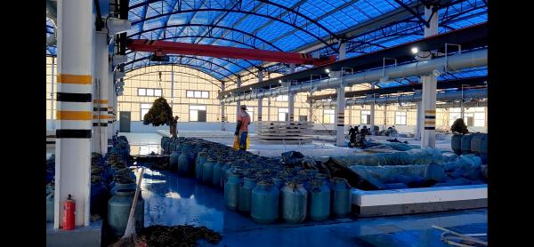 记者在雪菜腌制现场看到,一座5000平米的车间的厂房内,分布着100多个腌制池,上面是可调整位置的吊车。成熟的雪菜收割下来,放在腌制槽中用盐水浸泡,最后用注入水的水袋压在上方。大约过45天,雪菜便腌制成功了。只见现场工作人员身穿防水服,站在水槽中,用双手把腌制好的雪菜捧出来放在吊车中;堆满吊车后,通过遥控器轻松将雪菜吊至指定地点装桶。