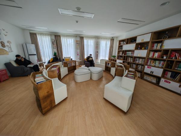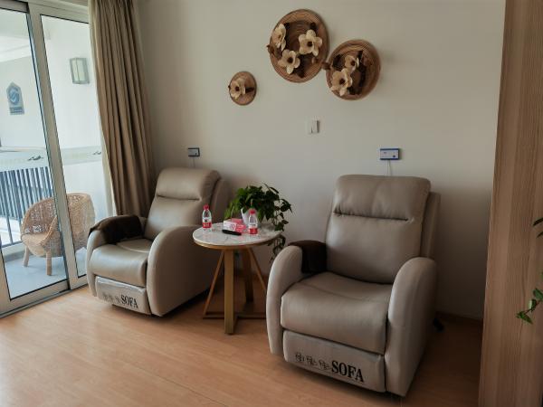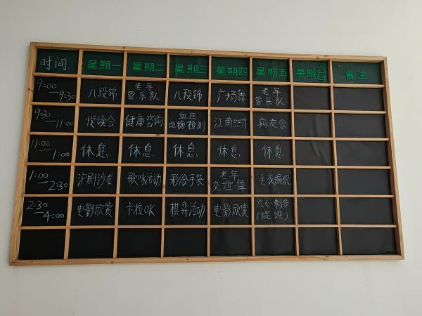 远远地,就听见一段经典的沪剧片段飘进耳朵。走近一看,20多位老人坐在一起,有的聚精会神地观看着,有的则眯着眼睛,跟随着轻轻哼唱。而在另一间休息室里,10多位老人正围坐着打牌。八段锦、悦读会、沪剧沙龙……门口的时刻安排表上,老年人的休闲时光被安排得满满当当。二楼,则安排了7间休息室,每间休息室都有两张可调节成平躺的沙发,还配有电视机、淋浴房。“休息室很紧俏,需要提前预订。”