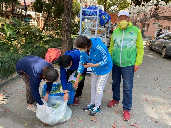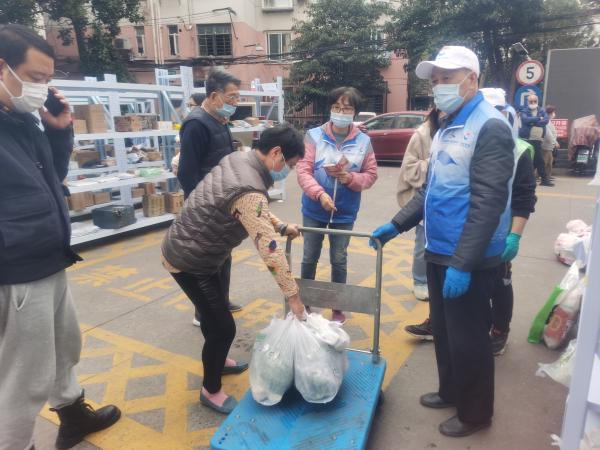 买菜是封闭小区里保障居民生活的一大难题。一般居民通过互联网平台下单,外卖员将菜放到门口,经过工作人员消杀后可取。但不少老人不会使用手机下单,还有几位外国居民看不懂中文,他们都可以到“买菜摊”求助。志愿者统一帮他们登记、下单,到货以后通知他们来取,或送上门,很多时候都是志愿者替老人垫付买菜费用。