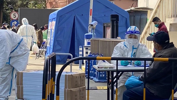 疫情发生后,五角场街道一共派出了30多名工作人员,由街道人大工委副主任范群力带队,成立了5个工作小组。服务保障组负责送生活必需品,为腿脚不便的老人服务,安抚居民情绪;扫楼组负责上门排查居民情况,组织大规模的核酸检测,在小区封闭后的第1、2、4、7、14天完成五次检测;安全维稳组负责大门看守和夜间巡查;数据组负责登记核对数据;医疗保障组负责开药配药。5个小组分工合作,确保小区在封闭期间正常有序地运行。