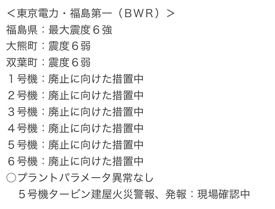 据日本广播协会报道,东北新干线列车在福岛站至白石藏王站区间发生脱轨,部分车厢倾斜,目前伤亡情况不明。福岛第一核电站5号涡轮机房出现火灾警报,消防部门前往现场后没有发现火情。福岛第二核电站1号和3号机组乏燃料池冷却泵停止工作。