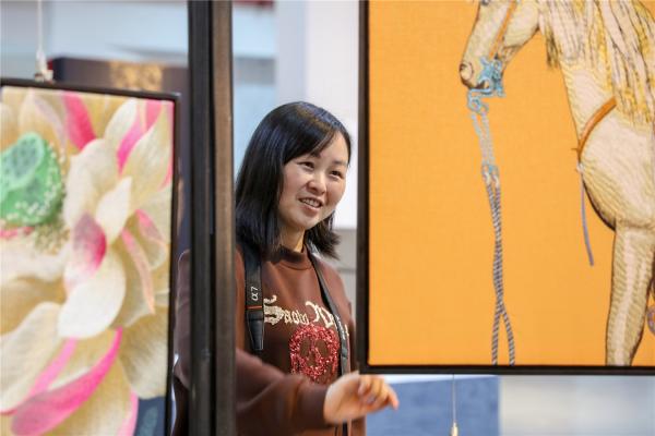 2022年3月15日,贵州省黔东南苗族侗族自治州施秉县特色苗族刺绣产业园内,游客在观赏苗族刺绣产品。(磨桂宾 摄)