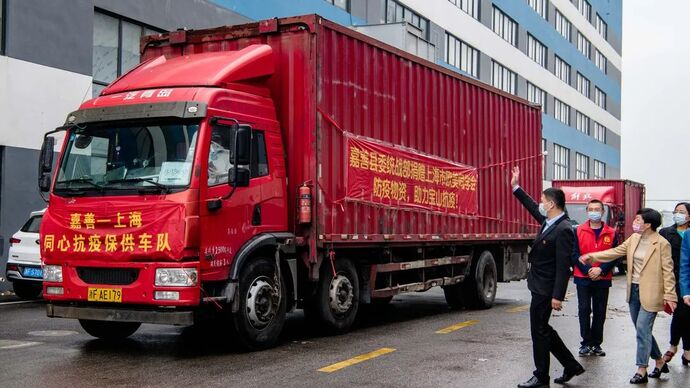4月14日下午,两辆贴着“沪善同心 上海加油”“嘉善县委统战部捐赠上海市欧美同学会抗疫物资,助力宝山抗疫”红条幅的货车,从嘉善出发驶抵上海市宝山区。这批物资由市欧美同学会牵头联系,经市委统战部协调,通过上海华侨基金会定点捐赠宝山区。