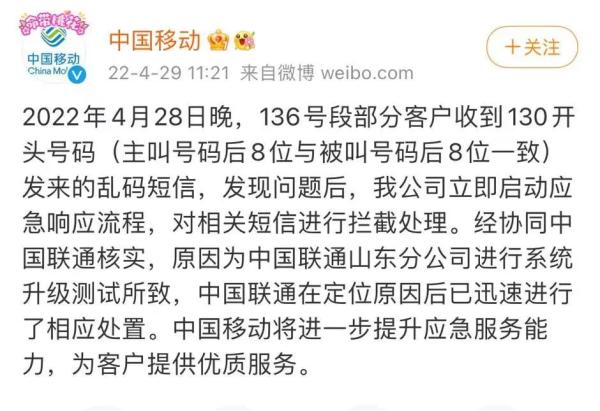 4月29日上午,@中国移动 回应:经协同中国联通核实,原因为中国联通山东分公司进行系统升级测试所致,中国联通在定位原因后已迅速进行了相应处置。