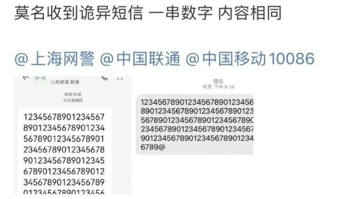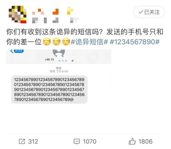 短信内容是一连串“1234567890”的重复数字,以@结尾。值得注意的是,发送短信的号码多以“130”开头,且余下号码与机主手机号一致。