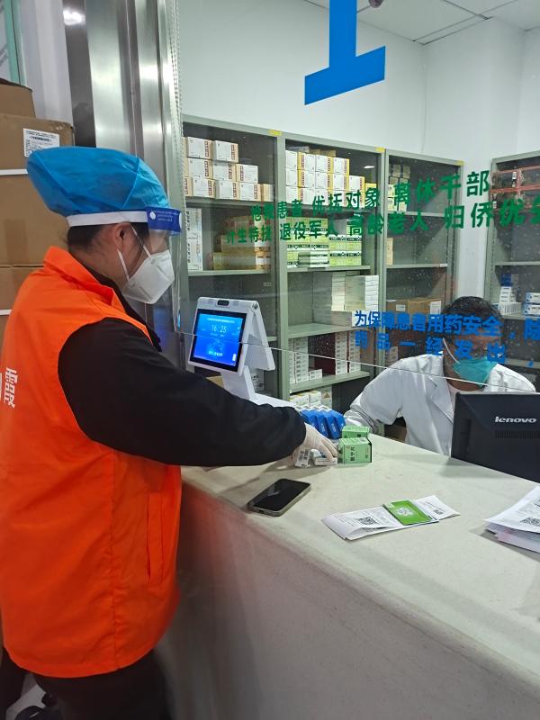 在入口关查验志愿者双码、核酸阴性报告,并进行流行病学史调查。做流调的同时,预检人员逐一核对居委预约志愿者的名单。为加快配药效率中心全科四个诊室全部开放,为合理分流,每个居委都提前分配好对应的诊室,配药结束付好费后再到药房进行取药。整个代配药流程快捷、清晰、方便。