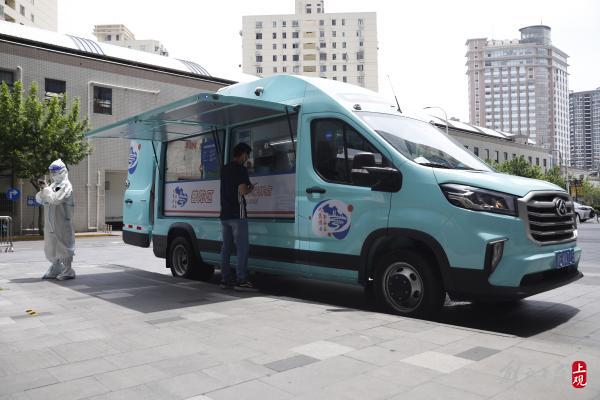 5月7日,一辆由上汽大通早餐车改造来的流动核酸采样车,在长风新村街道巡回为街面工作人员和居民进行核酸采样服务。 在月星环球港商圈驻留一小时,为商圈工作人员、商超保供人员提供了上门服务的便利采样。该采样车全天可完成1500人左右的核酸采样数量。