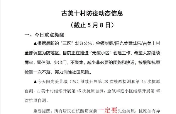 记者点开,“古美十村”微信公众号5月8日最新的“防疫动态信息”,有当日重点提醒、疫情概况和志愿者活动三大板块,居民从中可以知晓:当前小区全部调整为防范区,正推进“无疫小区”创建,社区无新增阳性病例、无转运阳性病例,当日古美十村志愿者团队将提供核酸大筛查、抗原发放、物资发放、特殊人群物资发放、楼道消杀和代配药等服务。