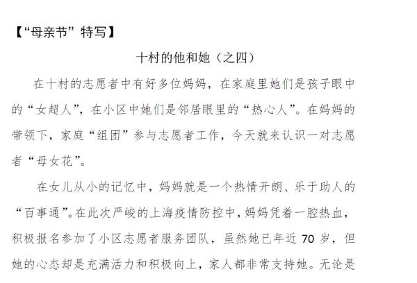 五一劳动节刚过,“古美十村”微信公众号又增设“志愿者团队信息”板块,讲述志愿者的故事。记者看到,“教授级”消杀员、“副教授”片区长、助理采样员“母女花”、“600号”采样员、志愿者父子兵和夫妻档、孕妈妈数据统计员等,一个个鲜活的志愿者服务案例跃然纸上。通过信息公开、主动宣传,之前被封控在家的居民,开始了解到:“原来,身边的邻居就在做志愿者;原来,他们真的很不容易!”