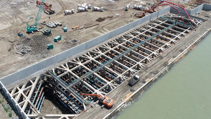 日前,随着“浇筑完成”指令的下达,最后一辆泵车驶离现场,中交三航局承建的长兴2号船坞项目首块坞口底板顺利浇筑完成,标志着项目复工后的首个重大节点“初战告捷”。 船坞基坑内设5道支撑围檩体系,底板分两层浇筑。此次浇筑完成项目是复工后的首个关键节点任务。