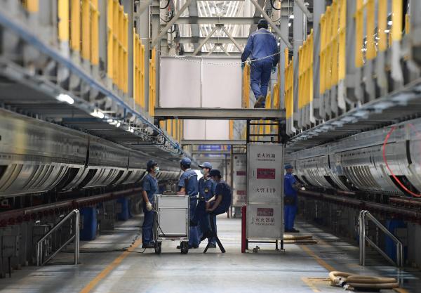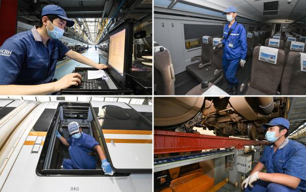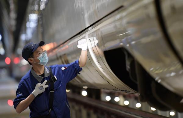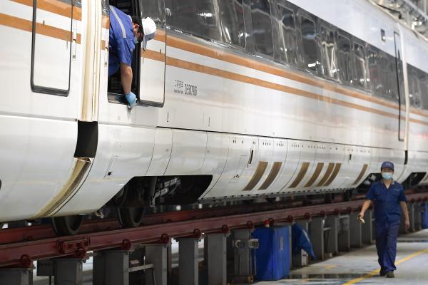 5月20日,作业人员在对动车组进行检修维护。