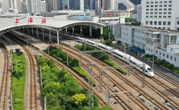 5月18日,一列配属于虹桥动车运用所的高铁列车由上海站缓缓开出。