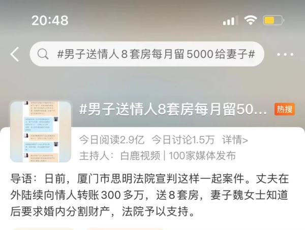 今天,#男子送情人8套房每月留5000给妻子#话题,冲上了微博热搜。