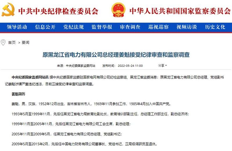 据中央纪委国家监委驻国家电网有限公司纪检监察组、黑龙江省监委消息:原黑龙江省电力有限公司总经理、党组副书记姜魁涉嫌严重违纪违法,目前正接受纪律审查和监察调查。记者梳理发现,姜魁已退休7年之久,年近70岁。