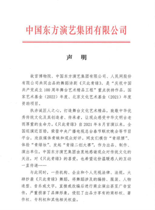 该声明称,故宫博物院、中国东方演艺集团有限公司、人民网股份有限公司共同出品的舞蹈诗剧《只此青绿》,是“庆祝中国共产党成立100周年舞台艺术精品工程”重点扶持作品,国家艺术基金(2022)年度、北京文化艺术基金(2021)年度资助项目。但一些机构、企业和个人无视法律、法规,大肆抄袭《只此青绿》舞蹈,将舞蹈涉及的编排、服装、人物造型、音乐或文字,直接或改编后进行商业演出甚至广告宣传,严重损害了品牌形象,侵犯了出品方享有的商标权、著作权、专利权和其他相关权益。