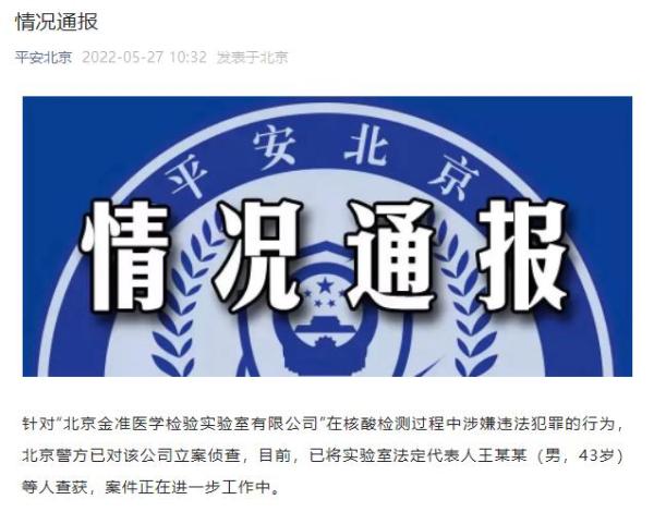 针对“北京金准医学检验实验室有限公司”在核酸检测过程中涉嫌违法犯罪的行为,北京警方已对该公司立案侦查,目前,已将实验室法定代表人王某某(男,43岁)等人查获,案件正在进一步工作中。