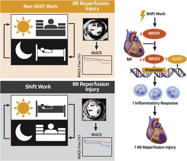 研究者通过一项前瞻性、多中心临床研究(nct03768453),连续性纳入急性st段抬高型心肌梗死、发病后12小时内接受了急诊再灌注手术治疗的患者。主要临床终点是再灌注术后心肌梗死面积,次要临床终点是主要不良心血管事件包括死亡、心肌梗死、心力衰竭和脑卒中等。研究发现,夜班轮班工作显著增加急性心肌梗死患者心肌再灌注损伤和微循环障碍风险。在5年的中位随访期间里,夜班轮班工作者心血管不良事件发生风险增加近2倍,这主要与心梗后心力衰竭的发生风险增加密切相关。在此基础上,研究者利用临床前大动物模型验证了上述临床现象,并发现了一条全新的心肌生物钟核受体调控信号通路。本研究提示维持节律稳态是一个潜在的心肌保护策略,为改善心肌梗死患者预后提供了新思路。