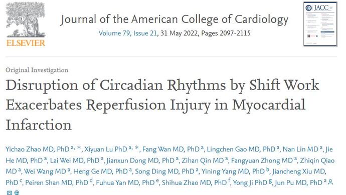 近日,上海交通大学医学院附属仁济医院心内科发表临床研究显示,熬夜或夜班工作等昼夜节律紊乱加重急性心肌梗死患者急诊再灌注术后心肌损伤,并导致长期临床预后不良。研究结果于5月24日在线发表于《美国心脏病学会杂志》(journal of the american college of cardiology,影响因子if=24),同期配发了编辑部评论,这一研究发现为急性心肌梗死患者心肌保护提供了新策略与思路。